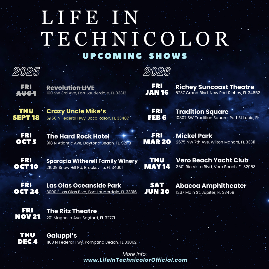 Life in Technicolor, a tribute to Coldplay, will be performing live at Crazy Uncle Mike’s in Boca Raton, FL on Thursday, September 18th, 2025, from 7:00-9:00pm. The band features Brett Miller as front man, alongside a phenomenal cast of players. Below is a flyer for all upcoming shows thru Summer 2026! See you soon!